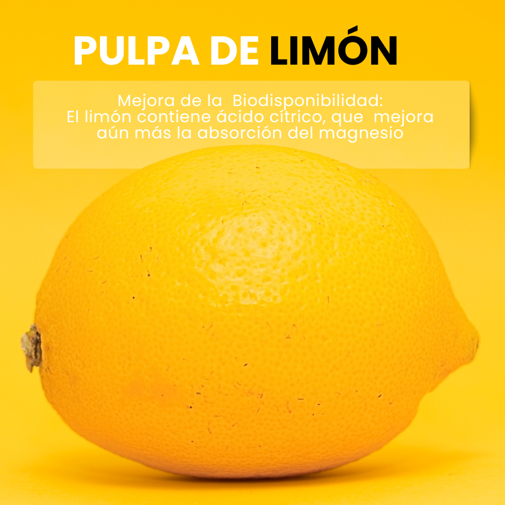Mejora de la Absorción (Biodisponibilidad): El limón contiene ácido cítrico. Aunque el glicinato de magnesio por sí mismo ya es conocido por su alta biodisponibilidad y buena tolerancia digestiva, el ácido cítrico puede ayudar potencialmente a mejorar aún más la absorción de minerales como el magnesio en el intestino. Al formar un compuesto, a veces se promueve como una forma "más absorbible".