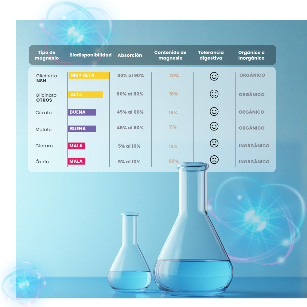 Es importante entender que la pureza del magnesio y su forma orgánica de glicina que es completamente quelado son las características que le confieren su gran biodisponibilidad y absorción en la célula.